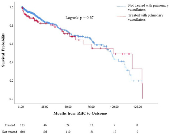 Similar proportions of patients in the treated PH and untreated PH groups from the entire cohort died without a lung transplant. A larger proportion of the untreated PH group received lung transplantation, while a larger proportion of the treated PH group was alive without a lung transplant at the last follow-up; the median survival time from PH diagnosis was similar between the two groups (Table 3). The Kaplan–Meier survival analysis of the entire cohort demonstrated similar survival probabilities between the treated PH group and the untreated PH group (logrank p = 0.67, Figure 2).