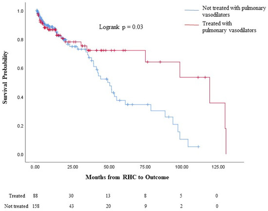 Though not statistically significant, a larger proportion of untreated severe PH patients than treated severe PH patients died without lung transplantation (Table 5). Similarly to the entire cohort, a significantly larger proportion of untreated severe PH patients underwent lung transplantation, while a significantly larger proportion of the treated severe PH group was alive without lung transplantation at the last follow-up. Notably, the median survival time among those with severe PH was significantly longer in the treated PH group (Table 5). The Kaplan–Meier survival analysis for the chronic lung disease and severe PH subgroup demonstrated increased survival probability from the time of RHC diagnosis of PH among those receiving PAH-specific therapy compared to that of those who did not receive PAH-specific therapy (logrank p = 0.03, Figure 3).