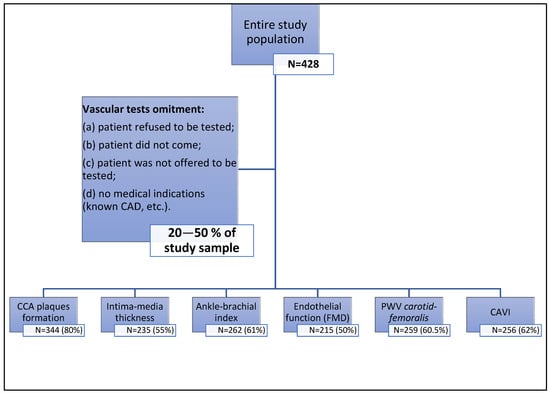 Selection of the patients for vascular markers testing. CCA—common carotid artery; FMD—flow-mediated dilation; PWV—pulse wave velocity; CAVI—cardio-ankle vascular index; CAD—coronary artery disease.