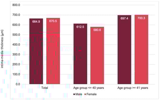 The first group (aged ≤ 40 years) consisted of 99 patients (54 males and 45 females), whereas the second group (aged ≥ 41 years) consisted of 236 patients (97 males and 139 females). The mean IMT in the entire study population was 668.99 μm (664.9 μm in males; 670.5 μm in females; p > 0.05). A statistically significant difference in IMT was detected between the same sex and different age groups (p < 0.001), whereas no significant difference was detected between males and females within each age group. In the ≤40-year-old group, the mean IMT was 598.0 μm (±84.7); among males, it was 612.5 (±88.2); and among females, it was 580.6 (±77.7) (p > 0.05). In the group ≥41 years, the mean IMT was 699.1 μm (±124.5); for males, it was 697.4 (±138.4); and for females, it was 700.3 (±114.4) (p > 0.05). The distributions of IMT between age groups and sexes are shown in Figure 2.
