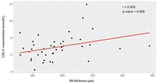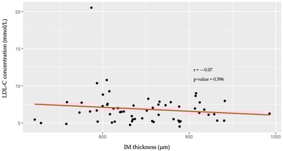 The intima–media thickness of the common carotid artery is a well-known indicator of cardiovascular risk because it reflects the thickening of the arterial wall caused by atherosclerosis. It has been proven that IMT correlates with the risk of both coronary syndrome and ischemic stroke [,]. Several risk factors are thought to affect IMT values: age, sex, smoking status, hypertension status and blood cholesterol levels [,,]. Multiple studies have investigated IMT in children with FH and have shown that children with FH have a greater IMT than healthy controls, but the progression of IMT can be significantly slowed by statin therapy [,]. The results of this study showed that age is an independent risk factor for IM thickening, whereas higher LDL-C was an independent risk factor for higher, still within the normal range, IMT only in younger patients (aged ≤40 years). The finding that age is a risk factor for increased IMT is supported by the study by Ogura et al., as it was reported that both the mean and maximum IMT significantly increased with increasing years of follow-up []. It should be noted that despite differences in median IMT values between study groups, median IMT remained within the normal range with a tendency to increase in younger patients with higher LDL-C concentrations.