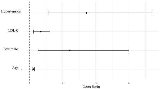 A total of 157 males and 187 females were included in this subanalysis. CCA plaques were detected in 98 males (62%) and 118 females (63%), p > 0.05. The ORs indicated that within the analyzed population, carotid plaque formation was more common among males (OR = 2.2; 95% CI: 1.2–4.0) and hypertensive patients (OR = 2.7; 95% CI: 1.6–4.7). Age and an increase in LDL-C of 1 had a less significant impact (age: OR = 1.1; 95% CI: 1.07–1.15). LDL-C: OR = 1.3; 95% CI: 1.12–1.6). The associations between cardiovascular risk factors and CCA plaque formation are shown in Figure 5. Other risk factors, such as smoking status and DM status, did not significantly impact carotid plaque formation within the analyzed study sample.
