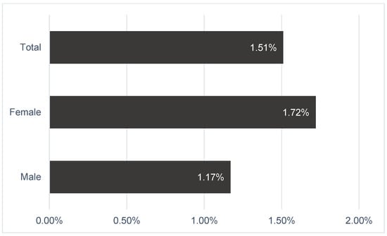 A total of 428 patients were included in this study—228 females (53%) and 200 males (47%). The general characteristics of the study sample are presented in Table 1. A statistically significant difference in the median age of diagnosis between sexes was found: the median age of FH diagnosis for males was 43 years, whereas for females, it was 53 years (p < 0.005). Smoking was also significantly more common among male patients, where 40% of males were smokers, while only 25% of females were smokers (p < 0.005). No significant difference in median LDL-C or the occurrence of DM was found between the sexes. Thirty percent (n = 127) of patients were genetically tested for FH-causing mutations. Mutations related to FH were found in 38.6% (n = 49) of the genetically tested patients, while no mutations were detected in 61.4% (n = 78) of the subjects. The most common mutation was of the LDLR gene, found in 55% (n = 27) of patients, whereas the second most common mutation was of the ABOB gene and was found in 31% (n = 15) of all genetically proven cases. One patient had a mutation in both LDLR and APOB genes, and for six patients, data on the location of the mutation was not available.