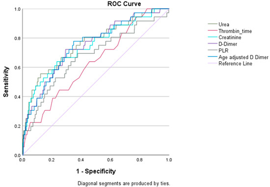 Receiver operating characteristic (ROC) curves for variables independently associated with 28-day mortality. Color code: urea—dark green, thrombin time—red, creatinine—light blue, D-dimer—purple, platelet/lymphocyte ratio (PLR)—dark grey, age-adjusted D-dimer—dark blue.
