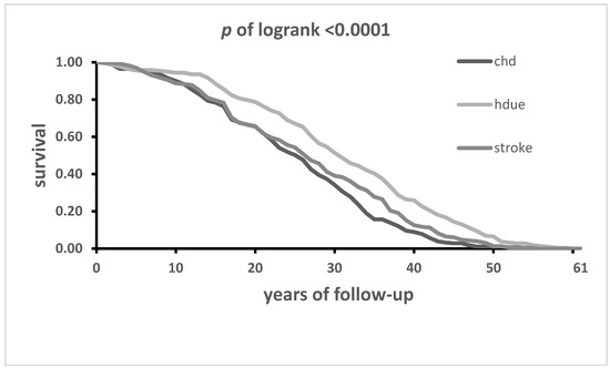Kaplan–Meier curves showed a highly statistically significant difference (p < 0.0001) among the three components of CVD mortality with a clear-cut and constant rightward displacement of the lifetime HDUE curve as compared to those of CHD and stroke (Figure 1).