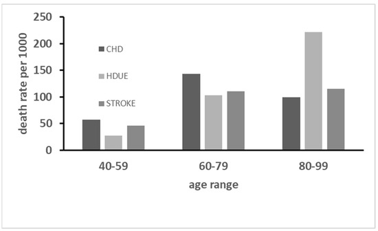The hypothesis was made of an important explanatory contribution of competing risks, a concept already documented on the same material using the 50-year follow-up data [17,18]. In other words, those with high cholesterol (and possibly other risk factors) are hit by a CHD event at a younger age while the others (relatively protected) become more exposed to other types of events that finally occur, but years later and at older ages. This likely explains part of the significant rightward displacement of the Kaplan–Meier curve for HDUE as compared to CHD and stroke (Figure 1) and the different age at death mainly comparing CHD with HDUE.