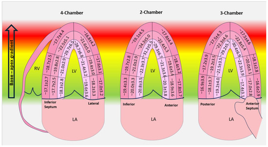Of note, segments with LS values as low as −10% for endocardial and myocardial layers and −7% for epicardial were identified. Knowing the lower limit of LS for each segment and layer is significantly important in clinical practice due to the potential overlap of LS values between normal and infarcted or abnormal segments [29]. However, we could state that in the normal population, the lower LS values were identified predominantly in the basal segments.