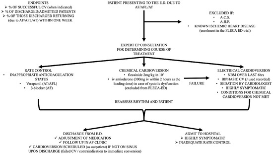 - Tsioufis, P.; Tsiachris, D.; Doundoulakis, I.; Kordalis, A.; Antoniou, C.K.; Vlachakis, P.K.; Theofilis, P.; Manta, E.; Gatzoulis, K.A.; Parissis, J.; et al. Rationale and Design of a Randomized Controlled Clinical Trial on the Safety and Efficacy of Flecainide versus Amiodarone in the Cardioversion of Atrial Fibrillation at the Emergency Department in Patients with Coronary Artery Disease (FLECA-ED). J. Clin. Med. 2023, 12, 3961. [Google Scholar] [CrossRef] [PubMed]