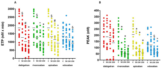 Thrombin generation parameters after the addition of increasing concentrations of dabigatran, rivaroxaban, apixaban and edoxaban. Dot plots report all single values of endogenous thrombin potential (ETP, panel (A)) and peak of thrombin generation (panel (B)). The horizontal lines represent the mean values. * p < 0.0001, ° p < 0.001, # p < 0.01, § p < 0.05 vs. the corresponding controls. C = control; 50 = 50 ng/mL; 150 = 150 ng/mL; 250 = 250 ng/mL.
