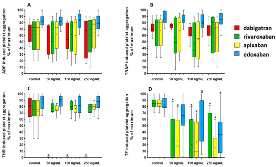 Platelet aggregation induced by different agents after the addition of increasing concentrations of dabigatran, rivaroxaban, apixaban and edoxaban. Box and whiskers Tukey plot reporting the median, 25th and 75th percentile and range for values of platelet aggregation in platelet-rich plasma (optical transmittance, in percent of maximum aggregation) induced by ADP (A), thrombin receptor-activating peptide (TRAP) (B), gamma-thrombin (THR) (C) and tissue factor (TF) (D). The asterisk within the bars reports the mean values. * p < 0.0001, # p < 0.01, vs. corresponding controls.