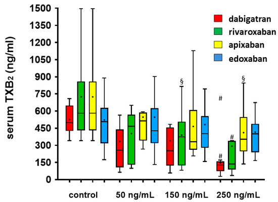 Serum TXB2 generation after the addition of increasing concentrations of dabigatran, rivaroxaban, apixaban and edoxaban. Box and whiskers Tukey plot reporting the median, 25th and 75th percentile and range for values of serum TXB2. The asterisk within the bars reports the mean values. # p < 0.01, § p < 0.05 vs. corresponding control.
