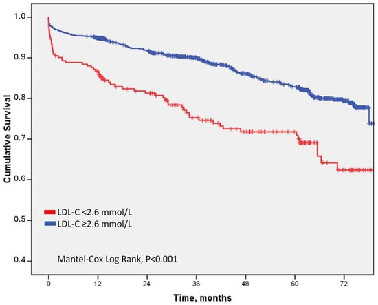 - Cho, K.H.; Jeong, M.H.; Ahn, Y.; Kim, Y.J.; Chae, S.C.; Hong, T.J.; Seong, I.W.; Chae, J.K.; Kim, C.J.; Cho, M.C.; et al. Low-density lipoprotein cholesterol level in patients with acute myocardial infarction having percutaneous coronary intervention (the cholesterol paradox). Am. J. Cardiol. 2010, 106, 1061–1068. [Google Scholar] [CrossRef]