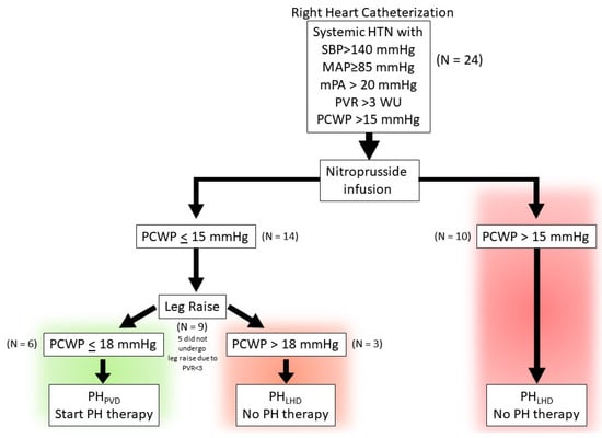 In this small study, we demonstrate how nitroprusside plus leg raise can be utilized to differentiate precapillary from predominant postcapillary pulmonary hypertension in a cohort of patients that exhibit systemic hypertension at the time of right heart catheterization. Post nitroprusside infusion, the predominant precapillary PH group was defined by a decrease in PCWP ≤ 15 mmHg with persistent elevation of PVR ≥ 3 WU, i.e., the PHPVD group. Pulmonary vascular-targeted therapy was well tolerated in the cohort of patients who had a PCWP ≤ 15 mmHg with infusion of nitroprusside and PCWP ≤ 18 mmHg with simultaneous nitroprusside infusion plus leg raise accompanied by improved functional parameters.
