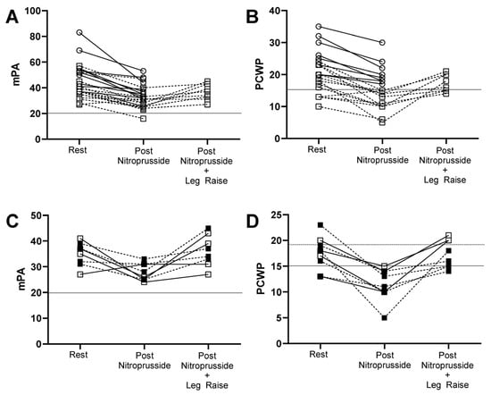 Course of mPA and PCWP response from rest, during nitroprusside infusion, and nitroprusside with leg raise where applicable. (A,B): mPA and PCWP response including leg raise, respectively, of (○ with solid line) PHLHD and (□ with dotted line) PHPVD. (C,D): mPA and PCWP response of PHPVD group, respectively, of (■ with dotted line) PHPVD group with PCWP ≤ 18 with nitroprusside and post leg raise and (□ with solid line) PHPVD > 18 with nitroprusside and post leg raise. Each line connects the same patient with each condition.