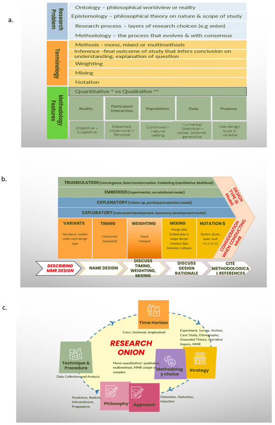 Analysis of research data and determining what information is needed in Phase IV translational work: (a) defining the problem, terminology and methodology; (b) designing mixed methods research; (c) the research onion. Abbreviations: data use = converged data collection; (+) simultaneous; (→) sequential; quan = quantitative; qual = qualitative uppercase = dominant method used, e.g., QUAL; lowercase = lower-priority method, e.g., qual; vs = versus [19] Glossary: http://www.fiu.edu/~bridges/glossary.htm, accessed on 12 November 2023.