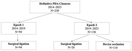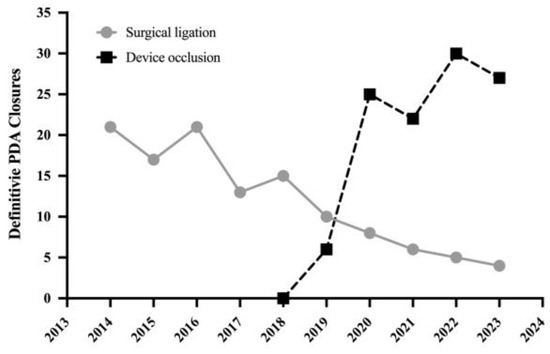 - Lai, K.C.; Richardson, T.; Berman, D.; DeMauro, S.B.; King, B.C.; Lagatta, J.; Lee, H.C.; Lewis, T.; Noori, S.; O’Byrne, M.L.; et al. Current Trends in Invasive Closure of Patent Ductus Arteriosus in Very Low Birth Weight Infants in United States Children’s Hospitals, 2016–2021. J. Pediatr. 2023, 263, 113712. [Google Scholar] [CrossRef]
