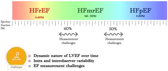 Heart failure (HF) is growing in prevalence and represents a significant global health challenge. Despite the availability of effective treatments, HF patients face poor prognoses, with high rates of hospitalisation and annual mortality ranging from 10 to 35% across various population-wide registries [1,2]. Advanced HF carries even higher mortality rates. The left ventricular (LV) ejection fraction (EF), assessed typically through echocardiography, is pivotal for HF diagnosis (Figure 1), prognosis, patient classification, and treatment decisions. The 2021 European Society of Cardiology (ESC) guidelines categorise HF into three types, based on LVEF: preserved (HFpEF; EF > 50%), reduced (HFrEF; EF < 40%), and mildly reduced (HFmrEF; EF 41–49%) [3]. Research indicates that HFmrEF not only shares characteristics of both HFrEF and HFpEF but also exhibits distinct features [4,5].