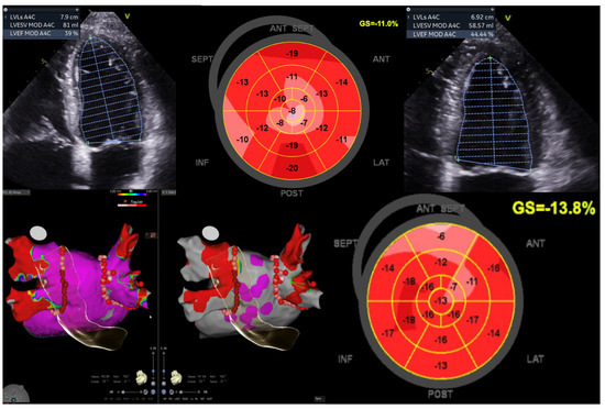 Illustration of LV function improvement (EF 44.4%, GLS −13.8%) in a 52-year-old male diagnosed with Tachy-Brady syndrome with LV dysfunction (EF 39%, GLS −11%), who underwent dual chamber pacemaker-left bundle branch area pacing, followed by atrial fibrillation ablation (pulmonary vein isolation). This case underscores the significance of conduction system pacing and echocardiography when using a global longitudinal strain (GLS) assessment for evaluating improvement in LV function. Image sourced from the Canberra Heart Rhythm Centre.