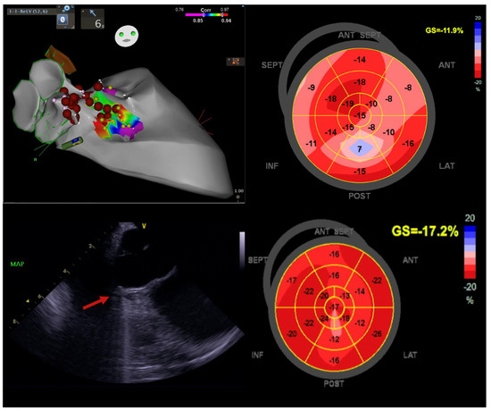 - Raja, D.C.; Samarawickrema, I.; Srinivasan, J.R.; Menon, S.; Das, S.K.; Jain, S.; Tuan, L.Q.; Desjardins, B.; Marchlinski, F.E.; Abhayaratna, W.P. Correlation of myocardial strain by CMR-feature tracking with substrate abnormalities detected by electro-anatomical mapping in patients with nonischemic cardiomyopathy. J. Interv. Card. Electrophysiol. 2023, 66, 2113–2123. [Google Scholar] [CrossRef]