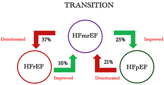The transition of patients from HFpEF to HFmrEF and their further deterioration from HFmrEF to HFrEF represents a critical challenge in the management of heart failure (Figure 7). Seminal studies involving 4942 patients have shed light on this complex dynamic, revealing concerning trends [66]. Among HFmrEF patients, a notable 37% deteriorated to HFrEF, while only 16% showed improvement from HFrEF to HFmrEF. Conversely, HFpEF patients demonstrated a lower but still significant tendency toward transition, with 21% deteriorating to HFmrEF and 25% improving to a preserved ejection fraction (Figure 7). This data underscores the heightened risk that HFmrEF patients face in progressing to HFrEF, highlighting the need for vigilant monitoring and proactive management strategies to mitigate such transitions and optimise patient outcomes.