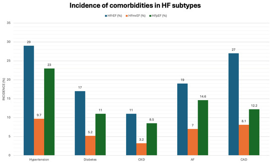 Highlights the incidence of comorbidities in various subtypes of heart failure. It is interesting to note the lower incidence of comorbid conditions in HFmrEF, highlighting possible independent risk factors involved in the prognosis of these patients [66]. Identifying these could be the first step in predicting HFmrEF patients progressing to HFrEF.