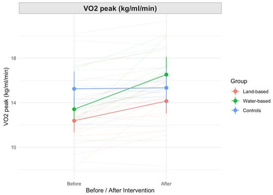 Our study inherits several limitations from the original study, where these constraints were also outlined [,]. The post hoc analysis conducted in our study presents several additional limitations. Firstly, the retrospective nature of the analysis introduces inherent biases and constraints in establishing causality. Additionally, the reliance on existing data collected for another purpose may not fully capture all relevant variables or account for potential confounding factors. The relatively small sample size and uneven distribution of patients between the three groups may limit the generalizability of the findings. Moreover, individual responses to exercise varied (as depicted in Figure 1 by different slopes in the spaghetti plot graphs) and larger studies with more participants accounting for individual variation in response to exercise training are warranted. Finally, while post hoc analyses can generate hypotheses for future research, they cannot replace the rigor of prospective studies designed specifically to address the research question at hand. These limitations underscore the need for further investigation into the effects of water-based exercise in cardiac rehabilitation for older adults with CAD.