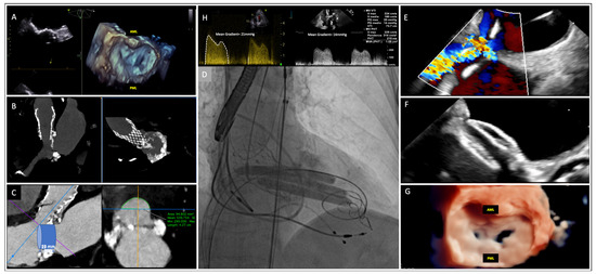 An 82-year-old woman was referred to our center for severe degenerative mitral stenosis (DMS), which led to NYHA IV symptoms. Transesophageal echocardiography (TOE) revealed a normally functioning CoreValve Evolut R 26 mm (Medtronic, Minneapolis, MN, USA) in the aortic position, a preserved ejection fraction, and severe calcification of the mitral annulus extending to the leaflets, with a severely high mean gradient of 21 mmHg and mild regurgitation (Figure 1A,B,H). The heart team deemed the patient inoperable (EuroSCORE II = 57%), and valve-in-mitral annular calcification (MAC) was excluded because of the high risk of left ventricle outflow tract obstruction (LVOTO) (Figure 1C). Concerns were raised for PMC, both in terms of efficacy (commissures were spared from fusion, Figure 1A) and safety (Wilkin’s score = 16).