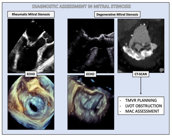 Diagnostic assessment in mitral stenosis. For rheumatic mitral stenosis, both transthoracic and transesophageal echocardiography serve as the primary diagnostic tools; in degenerative mitral stenosis, a CT scan is pivotal, primarily for the pre-procedural planning of a transcatheter procedure, as it could detect pitfalls, such as preventing left ventricle outflow tract obstruction.