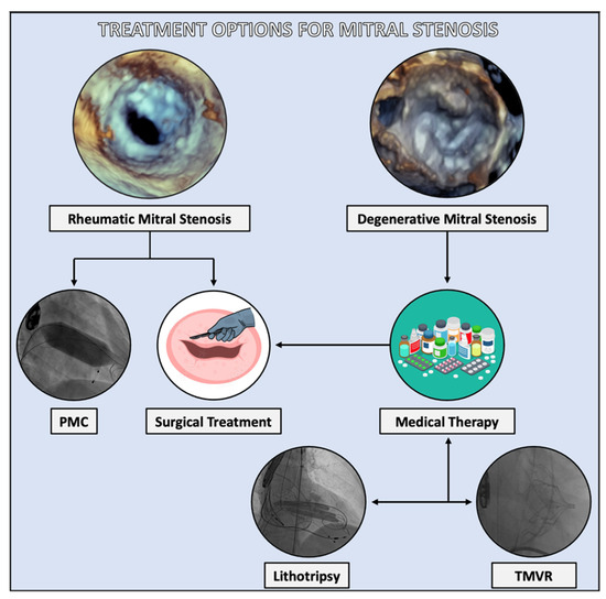 Therapeutic options for patients affected by severe RMS include percutaneous mitral commissurotomy (PMC) and MV surgery. Medical therapy is limited to addressing complications such as atrial fibrillation (AF) and congestive heart failure (CHF), as well as implementing secondary prophylaxis to prevent the recurrence of acute rheumatic fever (ARF) [30].