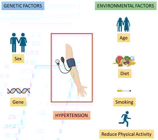 Overview of the main genetic and environmental factors involved in hypertension (Created with BioRender.com).