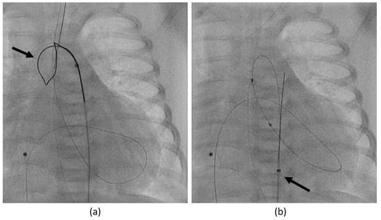 Angiography of balloon aortic valvulotomy (BAV) with antegrade access (posterior-anterior projection). (a) A coronary guidewire (asterisk) was positioned trans-venously up to the ascending aorta, where it was snared by a trans-aortic inserted loop (arrow). (b) After catching of the guidewire (asterisk), it was attached by the snare catheter (arrow) in the descending aorta to ensure stable balloon support during BAV.