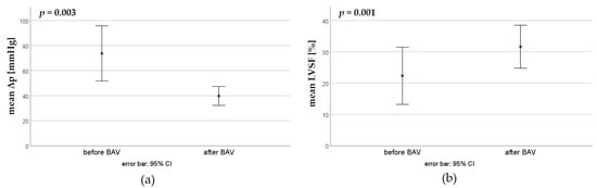 Effectiveness of the first BAV; paired t-tests. (a) Reduction in the trans-valvular pressure gradient (Δp). (b) Increase in the left ventricular shortening fraction (LVSF) by the first BAV.