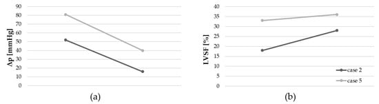 Effectiveness of the second BAV; paired t-tests. (a) Reduction in the trans-valvular pressure gradient (Δp). (b) Increase in the left ventricular shortening fraction (LVSF) by the first BAV.
