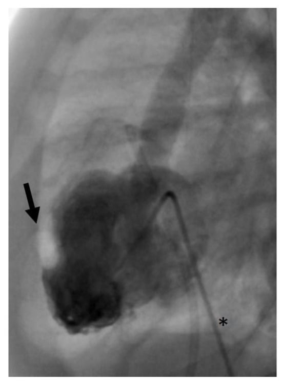 Figure 8. Angiographic image, lateral view. Air bubble (arrow) ventrally in the left ventricle during catheterization. The asterisk marks an angiographic catheter.