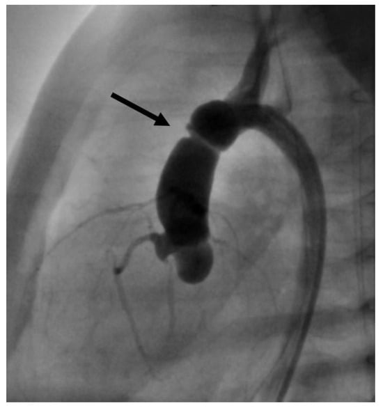 Figure 9. Angiographical image, lateral view. Intimal lesion with consecutive constriction in the ascending aorta (arrow).