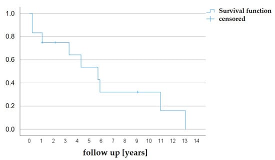 The follow-up duration was a median of 8.96 years (1.0–19.9). No patient was lost to follow-ups. To date, 9/12 patients (75.0%) had to undergo a surgical AV reconstruction due to progressive aortic regurgitation, aortic re-stenosis, or combined stenosis and regurgitation. Thereof, n = 6 patients had a unicuspid valve procedure, and n = 3 had a bicuspid valve procedure. For all cases, valvular cuspidity was confirmed by the surgeon. The earliest time for an operation was after 3 months. The median time to surgery (Kaplan–Meier estimator) was 5.75 years (Figure 10).
