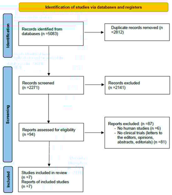 The results of the research and screening are illustrated in the PRISMA flowchart. (Figure 1). The initial search strategy identified 5083 articles from PubMed, Cochrane, PEDro, and Embase databases. The removal of duplicate publications excluded 2812 articles. Subsequently, from the screening of 2271 studies, 2141 were excluded after title or abstract assessment. Ninety-four studies were assessed for eligibility, of which 87 were excluded due to exclusion criteria. Therefore, seven studies met the inclusion criteria and were finally included in the review [21,22,23,24,25,26,27].