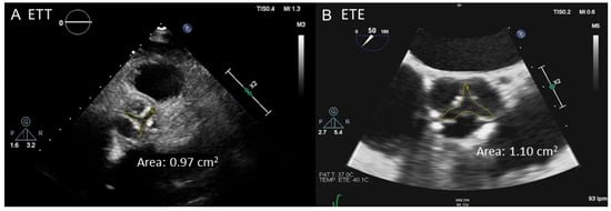 TEE can be helpful for AV morphological evaluation, although grading AS using Doppler techniques is challenging because of the difficulty in aligning the US beam with the valve orifice. Due to the anatomical proximity of the transducer to the AV and absence of pulmonary air interposition, TEE can visualize the valve structure with excellent definition in most patients. The feasibility of aortic AV planimetry is superior to that of TTE (90–95% according to different reports, see Figure 5) [29,30,31]. However, in cases of extensive leaflets calcification, the precision of this measurement may be reduced. Additionally, TEE is a semi-invasive test that requires sedation. For these reasons, TEE is reserved for selected cases (i.e., patients with high suspicion of severe AS and inconclusive TTE study due to poor transthoracic window).