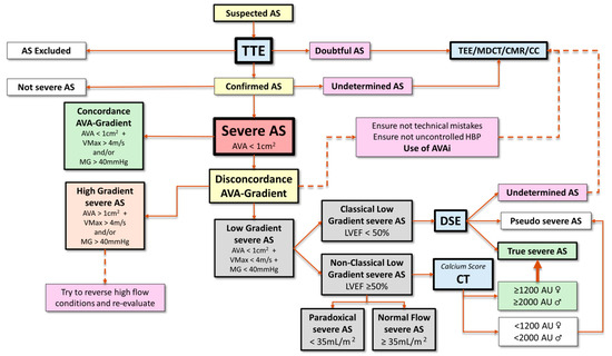 Central Illustration. When AS is suspected, an optimal TTE must be the first imaging test to be performed, including apical and non-apical views to evaluate flow velocities and pressure gradients. If AS is confirmed, grading parameters should be evaluated, as well as their concordance. As a result, three groups are established: concordant severe AS (green box), discordant high-gradient severe AS (orange box), and discordant low gradient (LG) severe AS (grey box). Discordant severe AS need further assessment. In the case of discordant high-gradient AS, it is mandatory to exclude high-flow conditions and, if those are present, re-evaluate AS under normal flow if such conditions can be amended. Discordant LG AS can also be subdivided into three subgroups. Classical LF–LG severe AS benefit from DSE to differentiate true severe from pseudosevere AS. Paradoxical and NF–LG AS should be evaluated with MDCT (calcium score). Finally, when undetermined results are obtained, further assessment using alternative imaging tests (i.e., TEE, CMR) can be helpful to reach a final AS grading. AS: aortic stenosis. AU: Agatston units. AVA: aortic valve area. AVAi: indexed AVA. CC: cardiac catheterization. CMR: cardiac magnetic resonance. CT: computed tomography. DSE: dobutamine stress echocardiography. HBP: high blood pressure. MDCT: multidetector computed tomography. MG: mean gradient. TEE: transesophageal echocardiography. TTE: transthoracic echocardiography. VMax: transvalvular flow maximal velocity.