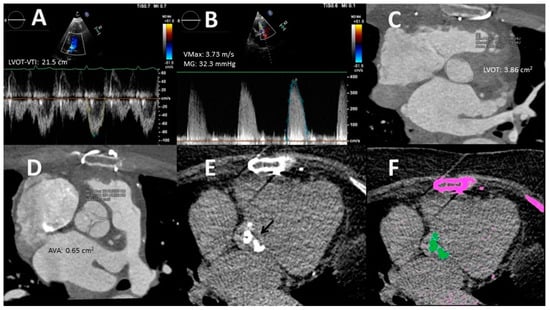 - Measurement valve calcification. The presence and extent of valvular calcification, quantified by the calcium score using the Agatston method, has been shown to be a predictor of severe AS, as well as of disease progression and development of adverse events [36]. The main application of the AV calcium score is the differentiation between true severe AS and pseudosevere AS, especially in the presence of preserved LVEF, LF, and significant diastolic dysfunction, i.e., patients with a restrictive diastolic pattern whose tolerance to dobutamine stress echocardiography (DSE) is limited. Cut-off values for severe AS vary according to gender (≥1200 Agatston Units (AU) in women and ≥2000 AU in men; valvular calcium density (AU/aortic annulus area) ≥300 AU/cm2 in women and ≥500 AU/cm2 in men [4,14,36,37,38]). In patients with concordant echocardiographic measurements of disease severity, the CT calcium score has a sensitivity and specificity of 87% and 84%, respectively, in females and of 80% and 82%, respectively, in males for identifying severe AS [39]. In contrast, in individuals with discordant TTE parameters, heterogeneity in CT calcium scores has been observed [39]. Severe valve calcification is present in ≈50–60% of the patients with LF AS, whereas, among discordant normal flow (NF) AS, it has been detected in 74% of the subjects with a VMax > 4.0 m/s, but only in 34% of the individuals with a VMax < 4.0 m/s [39]. It should be noted that CT does not assess AV fibrosis, which may contribute significantly to AS in some cases, such as in young individuals with bicuspid AV, although the proportion of such patients in LF scenarios is very low.