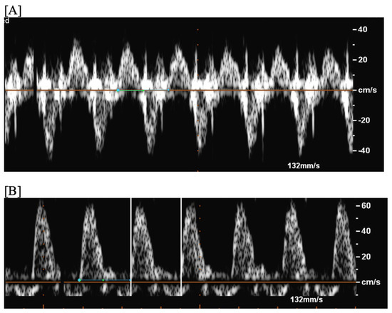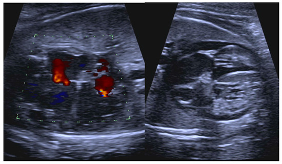 Second (2°)- or third (3°)-degree atrioventricular (AV) block is differentiated from blocked atrial bigeminy by a regular atrial rate with AV dissociation and slower ventricular rates (50–70 bpm); this is often best appreciated by hepatic venous Dopplers (Figure 8). The heart rate normalized a-a’ interval is 0.29 for BAB and 0.5 for 2°-AV block [68]. The isovolumic contraction time may be prolonged in 2°-AV block but not in BAB [67]. Etiologies of AV block include autoimmune-mediated (maternal anti-Ro/SSA antibodies), non-immune-mediated, congenitally corrected transposition of the great arteries (l-looped ventricles), heterotaxy syndromes (especially left atrial isomerism), and transient, benign AV block [69,70]. Third-degree AV block with associated complex congenital heart disease (ccTGA, left atrial isomerism) is associated with a mortality of ~100% in the presence of hydrops [69].