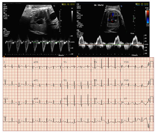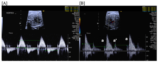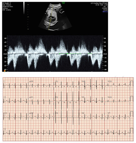 - Carvalho, J.S.; Prefumo, F.; Ciardelli, V.; Sairam, S.; Bhide, A.; Shinebourne, E.A. Evaluation of Fetal Arrhythmias from Simultaneous Pulsed Wave Doppler in Pulmonary Artery and Vein. Heart 2007, 93, 1448–1453. [Google Scholar] [CrossRef] [PubMed]