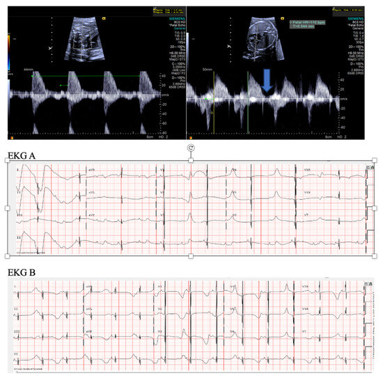 Sinus bradycardia is usually identified by persistent FHRs 90–130 bpm, regular atrial rates, and 1:1 AV conduction [2]. Etiologies for sinus bradycardia include, maternal hypothyroidism, effects from maternal medications (beta-blockers, anti-thyroid medications, methadone), anti-Ro/SSA mediated sinus node dysfunction, myocarditis, metabolic disorders (Pompe disease), Holt–Oram syndrome (TBX5 mutations; associated with right atrial enlargement, limb abnormalities, sinus bradycardia, and first-degree atrioventricular block), NKX2.5 mutations (Figure 6), LQTS and other heritable channelopathies or inherited bradycardia syndromes, fetal CNS abnormalities, fetal severe growth restriction or distress, and umbilical cord compression (usually transient and iatrogenic from the ultrasound probe) [2,9,66]. No treatment is recommended for fetal sinus or low atrial bradycardia, but diagnostic evaluation and monitoring are recommended [2].