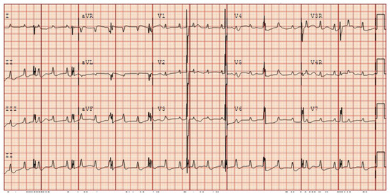Blocked atrial bigeminy (BAB) is a type of patterned premature atrial contractions in which every other atrial beat is non-conducted to the ventricles (Figure 7). This bradyarrhythmia is characterized by irregular atrial rates, with alternating short and long atrio-atrial (a-a’) intervals, and slower ventricular rates (60–90 bpm) than in sinus bradycardia [67]. While blocked atrial bigeminy is a benign arrhythmia, it increases the risk for developing supraventricular tachycardia to ~10% [12,15]. A postnatal EKG is recommended; for blocked atrial bigeminy that persists to delivery, 24 h continuous telemetry monitoring or 24 h Holter monitor after birth evaluates the risk for ectopic atrial tachycardia [15].