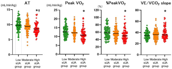 Exercise capacity in patients stratified by serum uric acid (sUA) into three groups (low, <5.3; moderate, 5.4–6.9; and high, >7.0 mg/dL), as assessed by cardiopulmonary exercise testing. AT, anaerobic threshold. * vs. low-sUA group (p < 0.05); † vs. moderate-sUA group (p < 0.05).