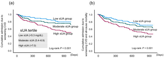 - When the patients were divided into three groups according to sUA level (<5.3, 5.4–6.9, and >7.0 mg/dL), the highest sUA group showed a significantly worse exercise capacity and composite endpoint (rehospitalization due to worsening CVD and all-cause mortality; p < 0.001) using the Kaplan–Meire method.