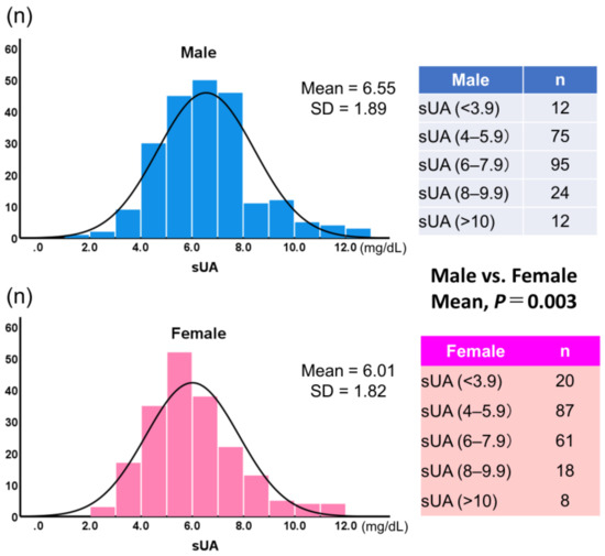 Histograms of serum uric acid (sUA) values by gender. sUA, serum uric acid (mg/dL).