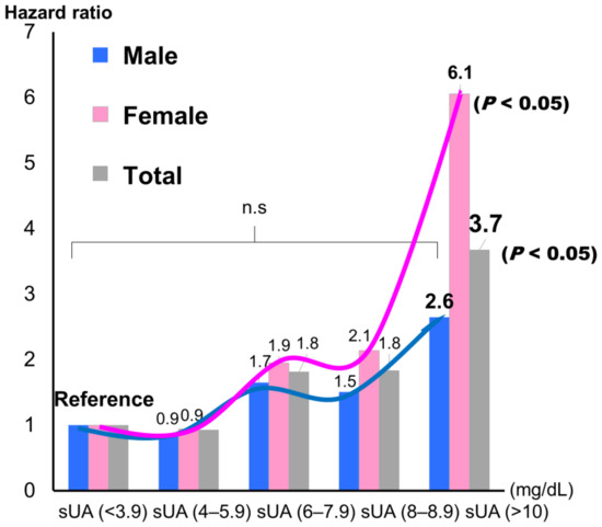 Figure 3 shows histograms of sUA by gender. Mean sUA was significantly higher in male patients than in female patients (6.55 ± 1.89, 6.00 ± 1.82, respectively; p = 0.003). When sUA was classified into five groups and the lowest group was used as the reference, the highest group showed a significantly higher incidence for the composite endpoint, but only in female patients (hazard ratio: 6.12; p < 0.05) (Figure 4).