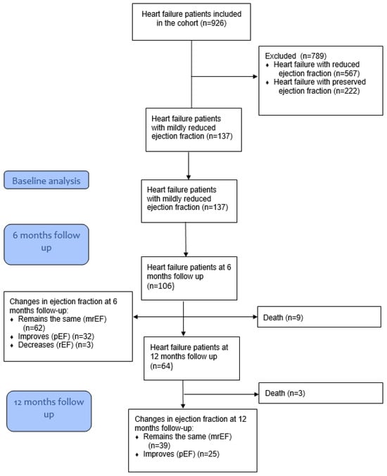 A flowchart of participants is shown in Figure 1. We followed 106 patients for 6 months (Table 3). LVEF remained the same in the majority of patients (n = 62, 56.4%), improved in 32 patients (29.1%), and decreased in 3 patients (2.73%) (Figure 2). At 6-month follow-up, eGFR values remained the same (68.18 vs. 66.21, p = 0.1026), haemoglobin levels improved (133.52 vs. 137, p = 0.001), and NTproBNP levels decreased (3672.28 vs. 1776.11, p = 0.0002). The majority of patients’ NYHA status improved (n = 57, 52% were considered to be NYHA I status at 6-month follow-up). LVEF decreased in three patients. We followed 64 patients for 12 months (Table 4): 39 were still categorized as HFmrEF (60.94%), 25 improved (Figure 3), with an LVEF over 50% (39.06%), and the majority was categorized as NYHA I status at the 12-month follow-up (n = 36, 56.3%). During the 12-month follow-up, there was a decrease in glomerular filtration rate (68.18 vs. 48.93, p < 0.0001) and an improvement in both NYHA functional status and NTproBNP levels.