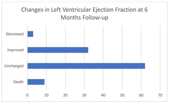 Changes in left ventricular ejection fraction at 6-month follow-up (n = 106).